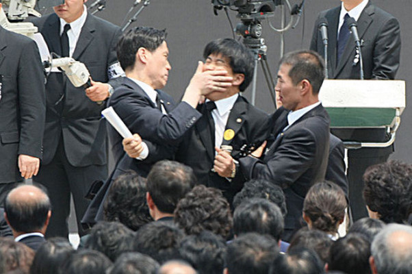 2009年5月,正接受检方调查的卢武铉突然跳崖身亡。在卢武铉出殡当天,时任民主党议员、现任青瓦台民政秘书白元宇向前来吊唁的李明博高喊:“你必须在卢总统的面前对政治报复谢罪”。但这个举动被当时治丧委员会负责人文在寅拦住。文在寅后来接受采访时表示,当时真的很想去抱住抚慰白元宇,但不管怎么样,对前来吊唁的人不能太过激。标题回顾: 李明博被提请逮捕 李明博和文谁的实力大